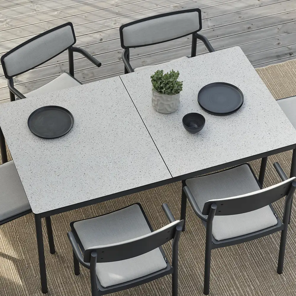 A series of modern outdoor tables for patios and gardens. All tables have a sturdy frame in lacquered aluminium that can be combined with table tops in teak or high-pressure laminate.