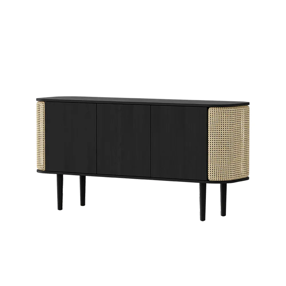 Treasures is available in oak, dark oak and black oak. The side panels can be chosen in Venetian rattan, brown faux leather or Horizons fabric in four carefully selected colours made from 100% recycled material.